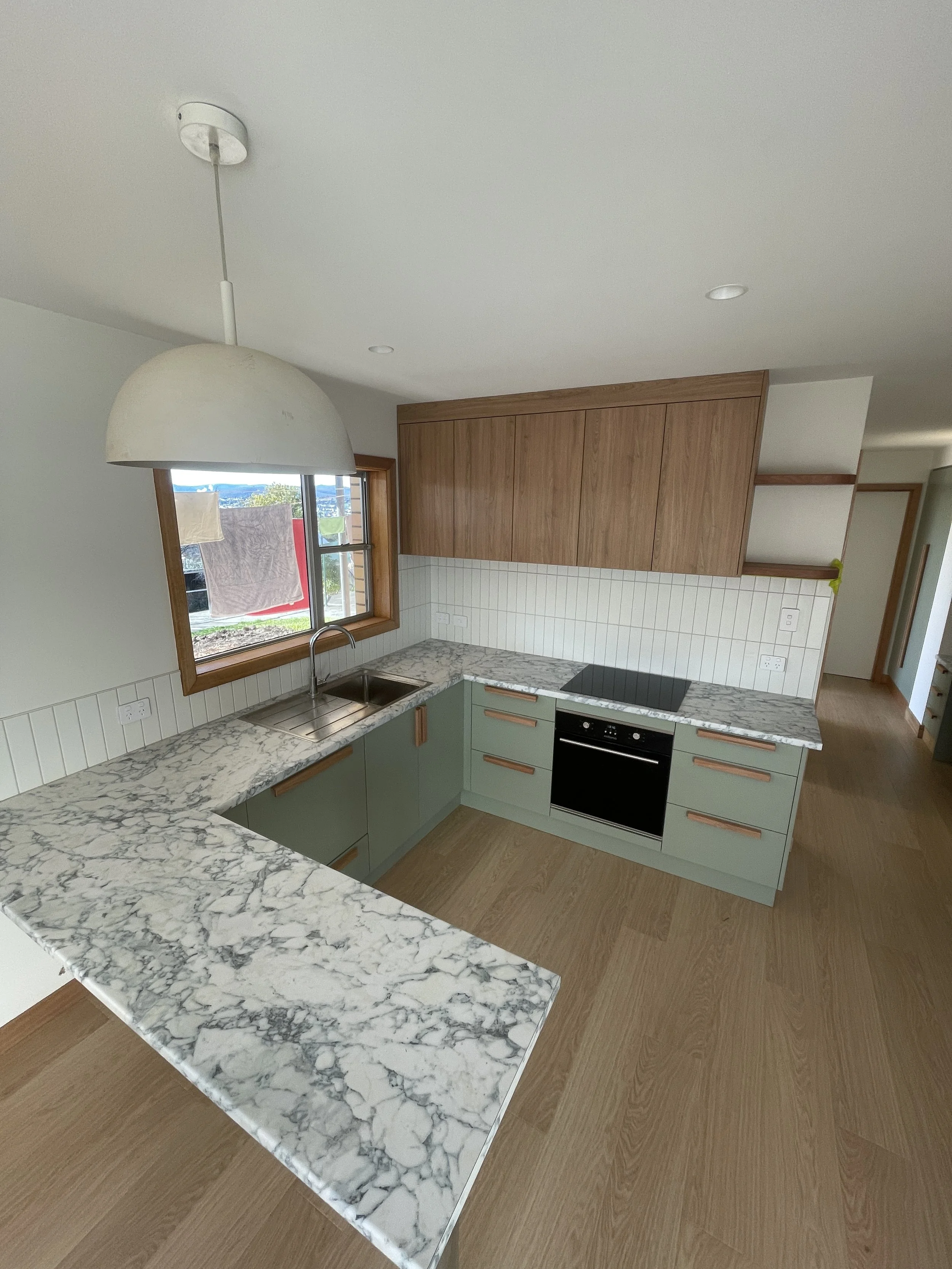 Tucked under an existing dwelling, this neat one bedroom apartment creates space through smart joinery design and mixing beautiful Tasmanian oak with refreshing bay leaf colours.